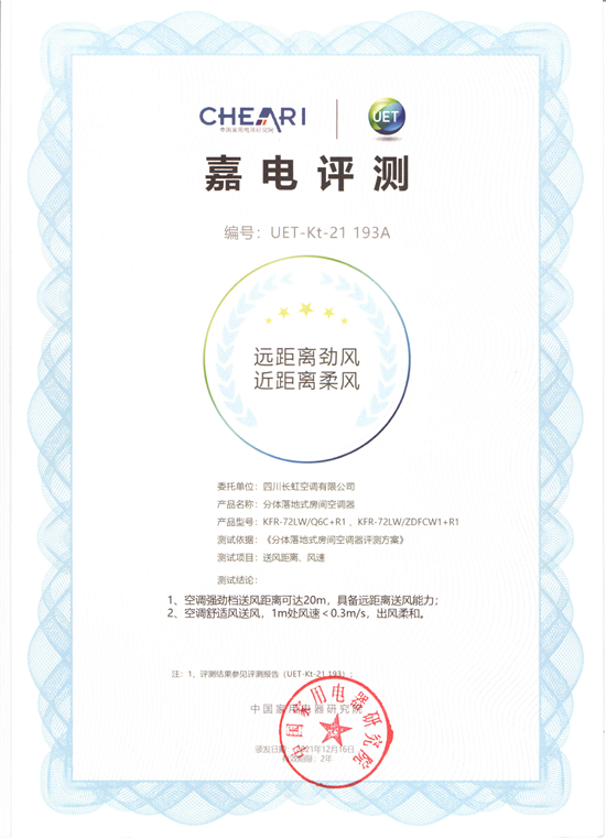 根據調研發現,“風口周邊自動避吹”是用戶非常喜歡的功能。用戶在使用空調的過程中經常手動調整空調扇葉的方向。如果空調能夠自動實現扇葉方向的調整,用戶將會獲得更好的使用體驗。為了解決餐廳的溫度控制問題,長虹空調公司的發明專利-黃金比例組合氣流技術通過增壓提速,實現20M超遠距離送風。根據實地測試,長虹客餐廳共享空調的遠投風風速依然可以達到每秒鐘0.350-0.395m,比傳統空調提升31%的送風距離,以滿足餐廳的需求。該測試結果通過了四川綿陽公證處公證員的公證,并且也通過了中國家用電器研究院的第三方檢測。