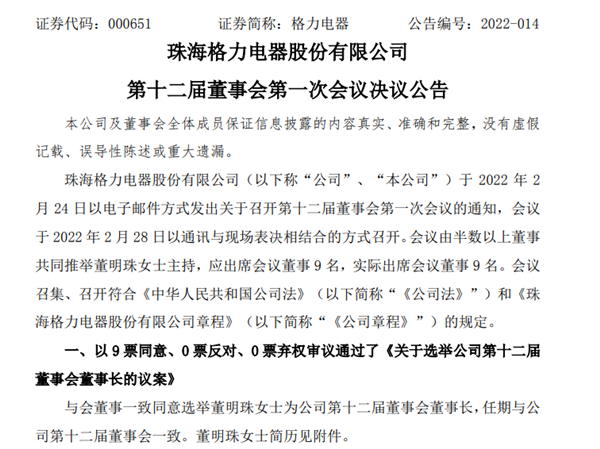 格力電器發公告稱,同意選舉董明珠為第十二屆董事會董事長。董明珠即將在格力電器開展為期三年的新一屆董事長任期。