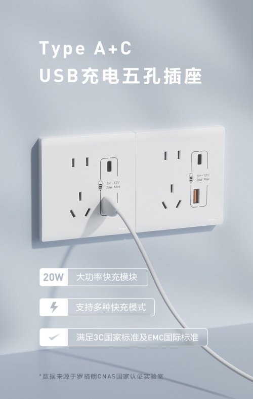 現代生活中人人手機不離身,電量時常告急。羅格朗緊跟時下插座的新潮流,推出了Type A+C USB充電五孔插座,20W大功率快充模塊,解決了傳統面板沒有USB接口的問題,無需插頭,一線即可馬上接電,方便手機時時在線。
