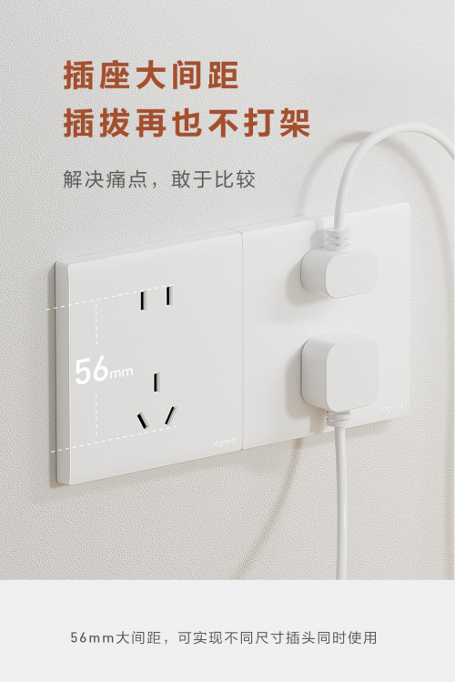 簡悅系列插座解決痛點,敢于比較,創新實現了56mm的大間距,可以同時使用不同尺寸的插頭,兩個插頭再也不會“打架”,人性化設計成為了本次新品的最大亮點。廚房區域常用的帶開關插座,大間距五孔插座搭配大按鍵開關,無需反復插拔插頭,一鍵通斷更加安全省心。