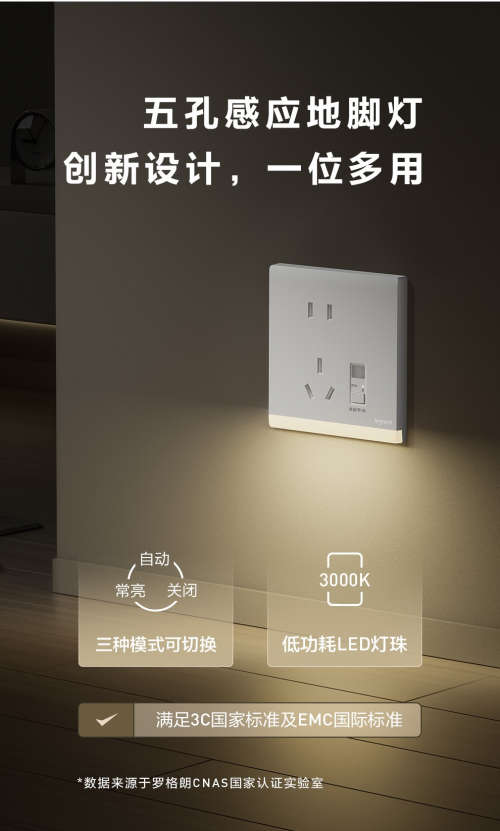 值得一提的還有五孔感應地腳燈,它是一款集多種功能為一體的電子產品。創新貼心設計,有自動、常亮、關閉三種模式可切換,不僅可以用于夜間人體感應照明,還可以當作五孔插座使用,讓地腳燈這類產品變得不再“雞肋”。