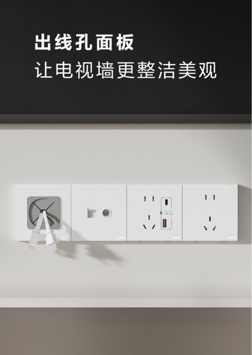 電視墻上一大堆線,亂成一團,不僅看上去雜亂不美觀,還有可能會影響到好心情。出線孔面板和其他面板一起聯排安裝,出線整潔有序,告別雜亂,為電視墻提供更加整潔美觀的用電解決方案,讓美好生活無雜紊。