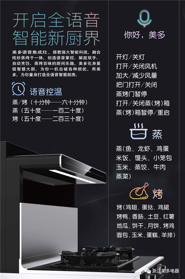 使用美多集成灶在燃氣灶點火瞬間,油煙機便能自動開啟,關閉燃氣灶時煙機還能延遲進行關閉。一開一關,殘留的油煙能夠完全的被吸凈,智能化的操作也可以讓下廚更加的輕松,像美多語音集成灶和科大訊飛強強聯合,廚房操作只需一聲“你好,美多,打開煙機”、“關閉煙機”、“加大風量”等語音指令,便會根據你的指令自動運行!