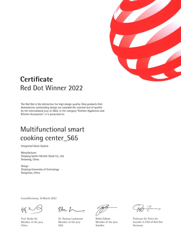 德國紅點獎是國際公認的全球工業設計頂級獎項之一,與德國iF獎、美國IDEA獎并稱為世界三大設計獎。其評選標準苛刻,對參賽作品的產品設計理念、創新水平、功能性和材料制造工藝等指標均有著極高要求。帥豐S65系列集成灶能夠成功獲得該獎項,標志著中國高端集成灶產品的又一次突破革新。