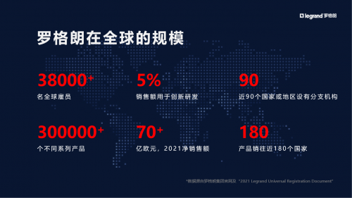 羅格朗是全球建筑電氣行業專家,成立于1865年,在近90個國家或地區設有分支機構,產品銷往近180個國家或地區,擁有超過38000名雇員。旗下經營了近70個商業品牌,擁有超過3500項工業專利、300,000個不同系列產品,包括開關插座、綜合布線、智能系統、樓宇對講、低壓電器、智慧養老等,廣泛應用于全球許多著名建筑,如法國羅浮宮、美國五角大樓、迪拜帆船酒店、北京雄安高鐵站、北京大興國際機場、上海迪士尼等。作為一家法國的上市公司,其股票被法國CAC40指數選為計算對象之一。