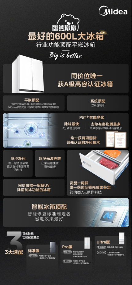 1、作為行業唯一獲A級高容認證的系列,美的熊墩墩系列用500L占地實現600L+容量,讓“小戶型也能擁有大冰箱”成為現實;