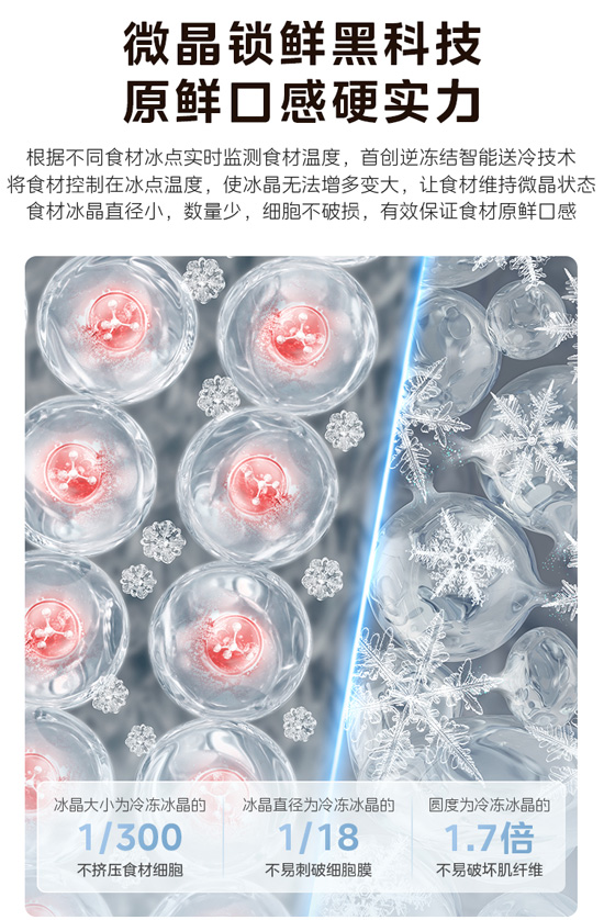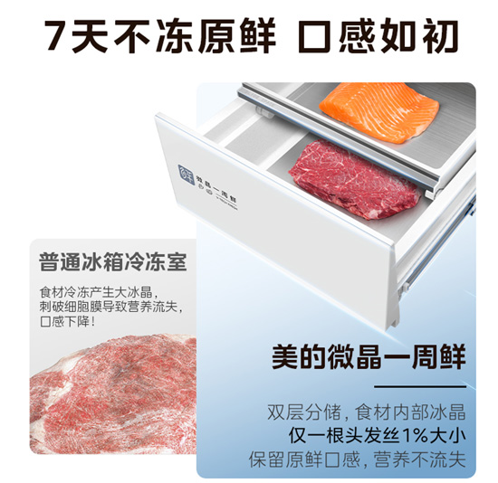 上了一天班回家做飯先要等肉化凍,熱水解凍、微波爐解凍口感流失,這個痛點困擾了用戶許多年。美的冰箱洞察這一用戶需求,2018年行業首發微晶一周鮮技術,引領行業第一次實現了肉類口感保鮮的效果。這項技術的核心突破在于對冰晶形態的掌控:通過智能溫控系統實時感知食材冰點變化,精準調控冷量輸送節奏,最終在食材內部形成尺寸僅為頭發絲直徑1%大小的微晶顆粒。這種極細微的冰晶結構從物理層面規避了傳統冷凍的弊端——既不會刺破肉類食材細胞膜導致營養流失,也不會破壞肌纖維結構造成口感發柴,真正實現了“在保鮮中鎖鮮”的效果。