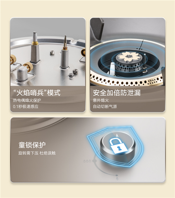美味背后,更需實實在在的安心相伴。櫻花御風燃氣灶S860G搭載“火焰哨兵”模式的熱電偶熄火保護,0.1秒可極速感應,熄火斷氣。安全加倍防泄漏保護,可在意外發生時,迅速切斷氣源。更有童鎖保護功能的旋轉下壓設計,杜絕孩童玩耍時的誤觸。櫻花御風燃氣灶S860G時刻守護家人安全,用細致入微的守護,讓烹飪時刻更無憂。