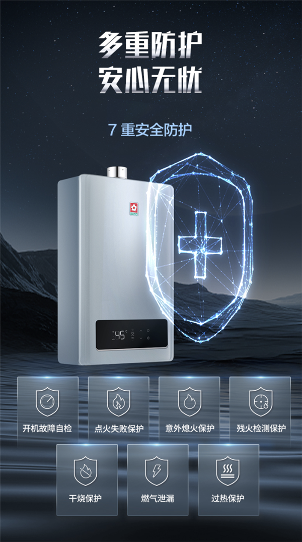 安全,是品質生活的底色。櫻花燃氣熱水器Q303內置七重安全防護系統,包含開機自檢、點火失敗保護、意外熄火保護、殘火檢測、干燒保護、燃氣泄漏報警、過熱保護。無論使用前還是使用中,安全都始終伴隨左右,讓每一次沐浴都無憂。