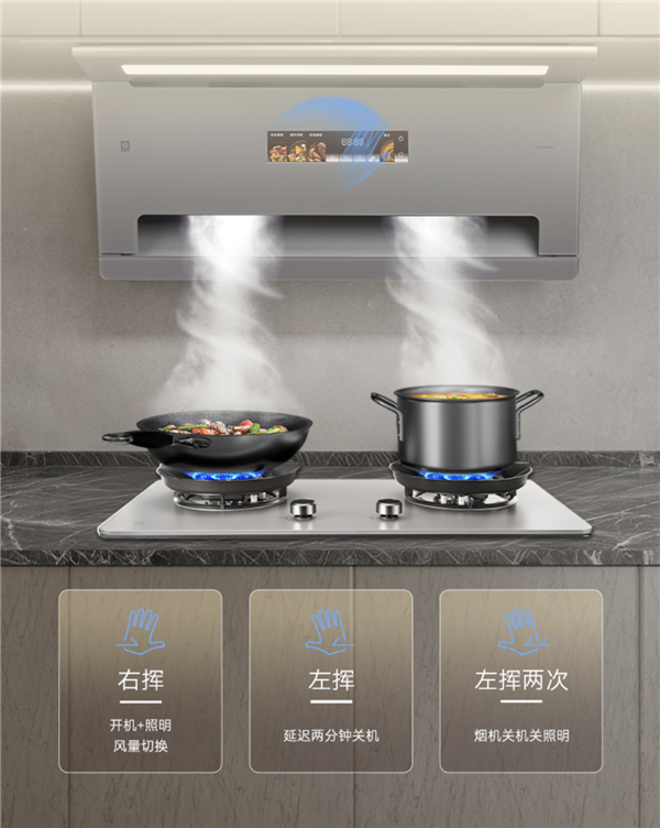 更令人心動的,是科技與日常之間那份不言而喻的默契。櫻花御風吸油煙機Q660M配備智能體感操控系統,只需輕輕揮動手臂,即可完成吸油煙機的啟停與調檔,無需觸碰的潔凈交互體驗,讓烹飪過程更加優雅。