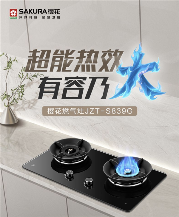 火候迅猛,鮮香美味更豐盈  餐桌上的每一道佳肴,都承載著對家人的細膩關懷。櫻花燃氣灶S839G以零秒開閥實現即點即燃,避免長時間按壓的等待,讓火力隨心而動。5.2kW超猛火焰讓每一次爆炒都能輕松駕馭食材,鎖住食材的鮮香質感;76%超高熱效確保每一份燃氣都被充分利用,讓家庭烹飪既高效又節約。