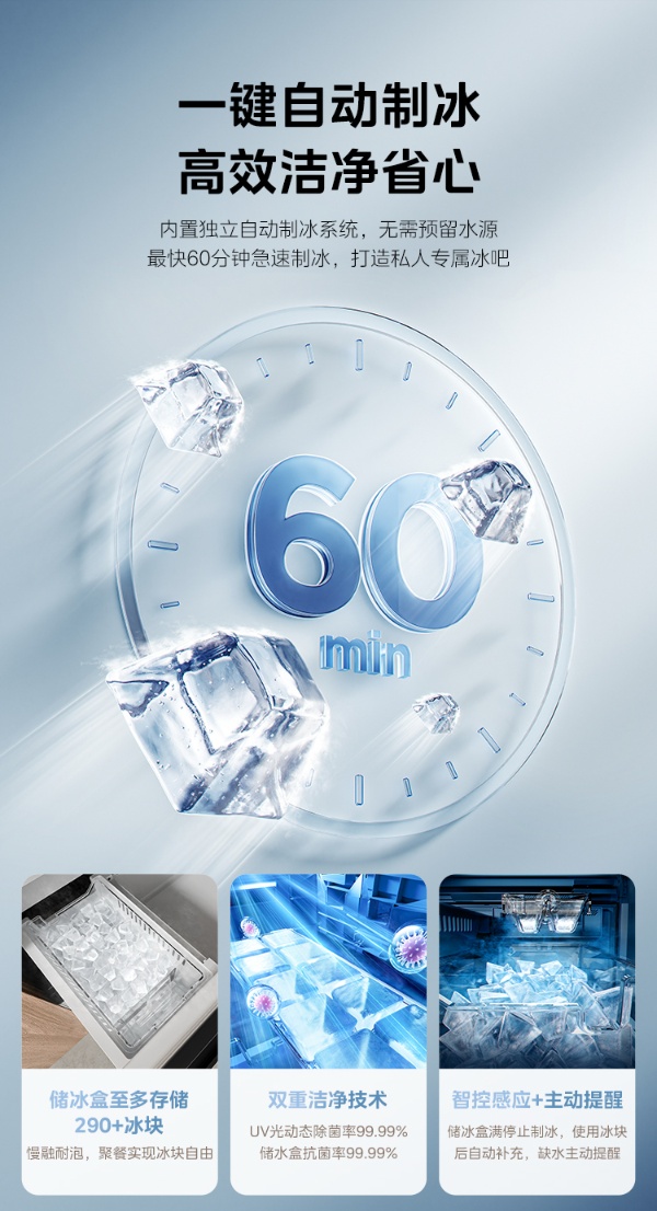 用戶對于制冰需求的增長,曾長期伴隨著“冰塊是否干凈”的深層焦慮。傳統冰箱制冰過程漫長,且模具、儲冰盒易成為細菌溫床;部分冰箱產品為追求制冰速度,犧牲了衛生保障,導致用戶體驗參差不齊。