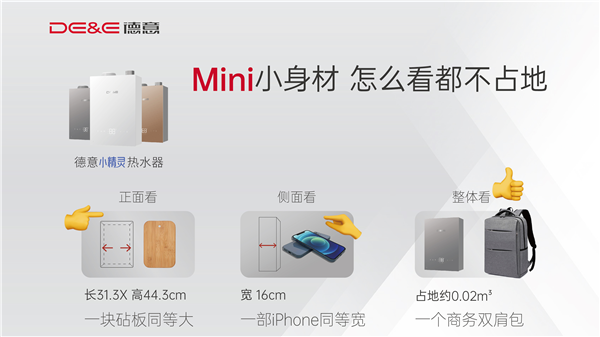 德意通過全新技術優化內部結構,將水路、風路與火路高效整合,使整機尺寸僅為443×313×160mm,占地僅0.02m³,體積縮小高達38%。從正面看,它與一塊砧板同大;從側面看,僅有一部手機的寬度;整體則如同一個商務雙肩包般輕巧。更小巧身材、更精致的設計,讓熱水器不再與空間“搶地盤”,用戶可隨心自由布局,輕松適配裝修需求,兼顧收納美感與操作便捷。